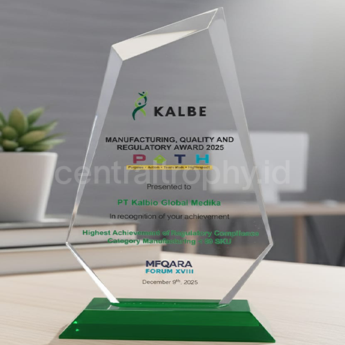 "Solusi penghargaan eksklusif untuk kebutuhan korporat dan turnamen. Trophy Crystal dengan desain modern dan potongan presisi, siap dikustomisasi dengan grafir logo serta teks. Berikan kesan profesional dan berkelas pada setiap acara penghargaan Anda."